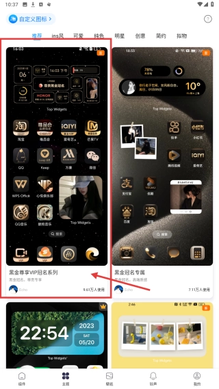 1、打开手机桌面美化类应用,点击底部主题选项,进入图标美化页面。