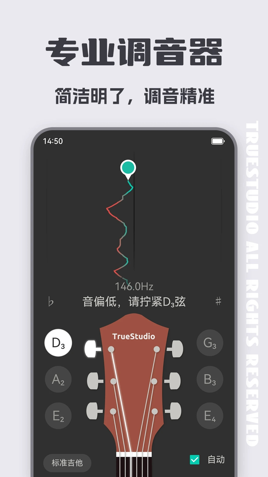 自动检测:自动检测当前弹奏的弦,并显示音高状态。