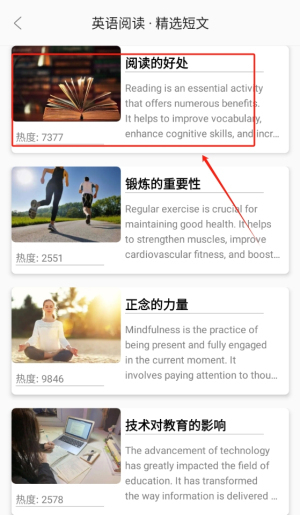 3、短文阅读功能,为用户提供丰富的英语短文资源以供在线阅读,助力用户将所学知识应用于实际语境,提升口语表达能力。
