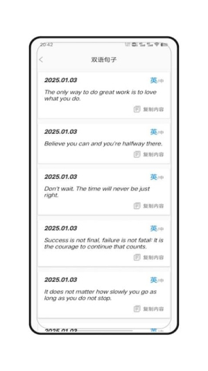 3、双语句子查看,用户可随时查看中英文对照句子,帮助理解并掌握常用表达,提升实际运用能力。