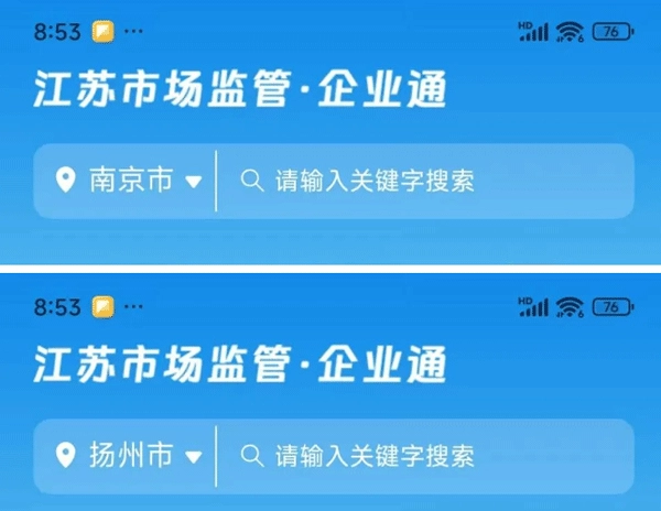 1、点开江苏省市场监管“企业通”进行登录,选择注册地,点击电子签章
