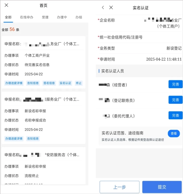 在正式申报前,您可以先通过“名称申报”功能单独提交名称申请(特别提醒:名称采用自主申报方式,全程无人工审核环节,但正式登记时仍有可能因不符合相关规定被驳回。因此,在名称未最终确认前,请不要急于制作标牌,以免造成不必要的损失)。若您在操作过程中有任何疑问,欢迎随时咨询在线客服。