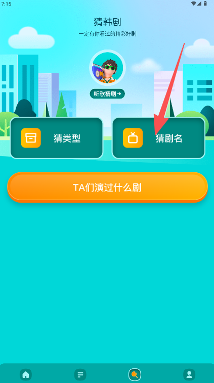 首页的猜剧名互动功能把影视场景和知识趣味融合起来,借助图文猜题的形式提升用户的参与感与娱乐体验。