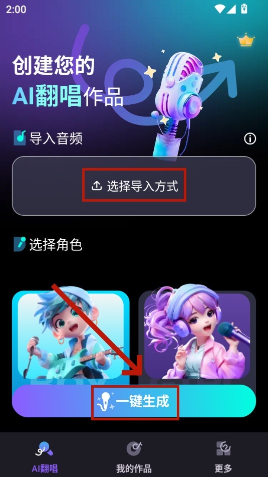 进入后点击选择导入方式来导入音频,选好角色后点击一键生成即可。