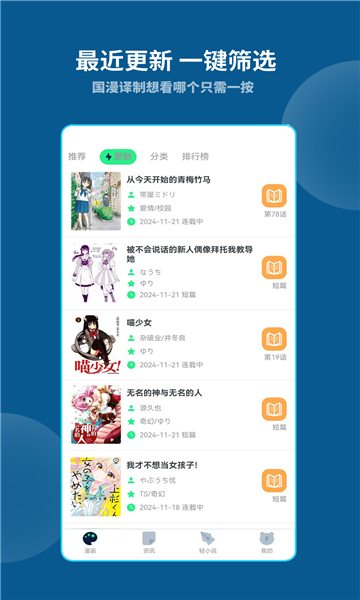 可以看到该软件设有三个专区,分别是漫画区、资讯区和小说区,其中首页可供浏览各类漫画。