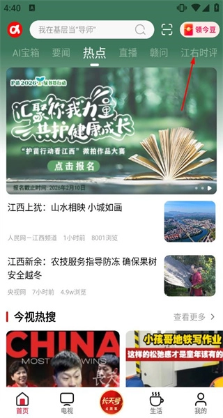 1、打开应用首页,找到“江右时评”选项并点击,进入该板块页面后,即可查看相关评论类内容。