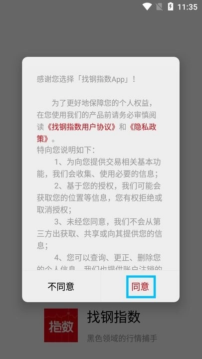 在本站安卓网打开找钢指数,阅读弹出的内容后点击【同意】按钮。