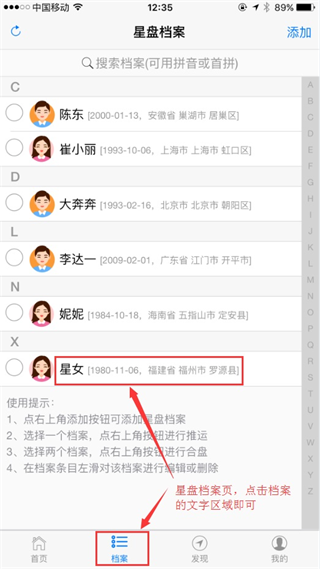 点击底部导航“档案”即可进入星盘档案管理页面,如果你还没有登录,请先登录