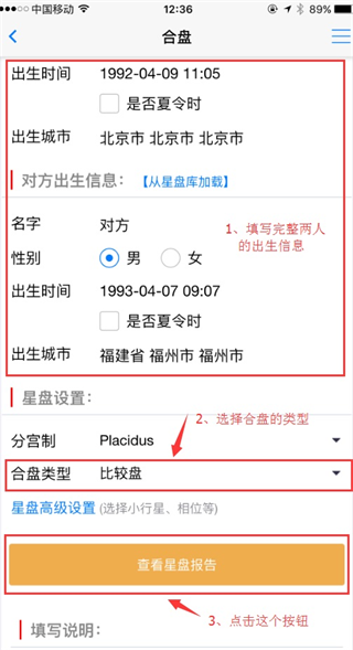 1、进入“首页”,点击其中的合盘进入,输入需要合盘的两人的出生信息,然后点击“查看星盘报告”