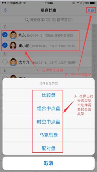 2、也可以进入星盘档案页面,挑选两个档案,点击右上角的“合盘”按钮,在弹出的合盘类型选项里选择所需的合盘类型