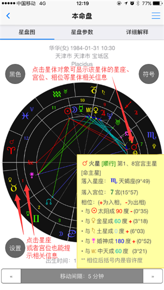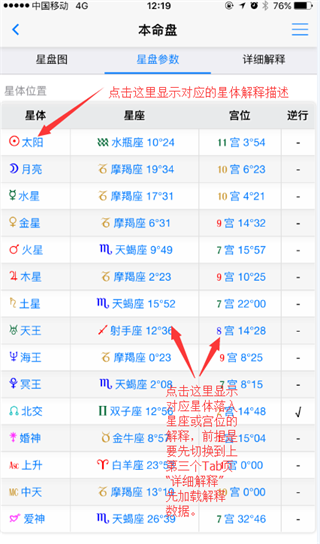 1、通过顶上的Tab选择或者手指左右滑动可以切换星盘图星盘参数列表和详细星盘解释二个内容