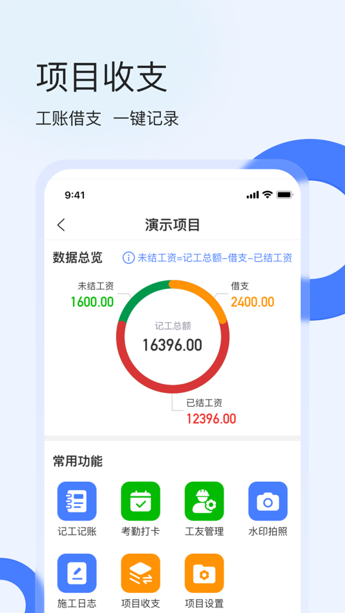 2、包工头可随时随地记录收支情况,账目明细尽在掌握;个人账单功能支持将每位工人的记工账单转发给个人,方便双方对账。