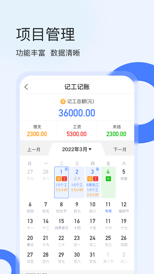 2、及时开展各类记工操作,针对不同的记工服务,能更快捷地在线了解与查看。