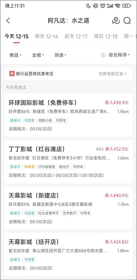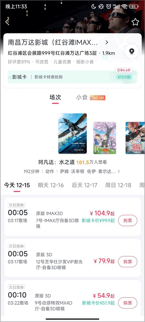 进入一家电影院后,能查看近几天放映的电影、场次及开场时间,点击右侧的购票按钮即可。
