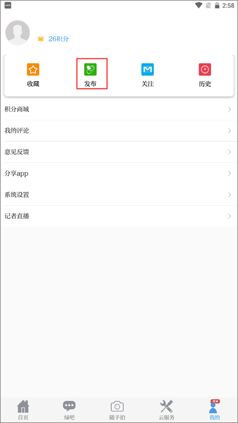 1、点击底部菜单栏的【我的】页面,这里包含收藏、发布、关注和历史等主要功能,接着点击“发布”按钮。