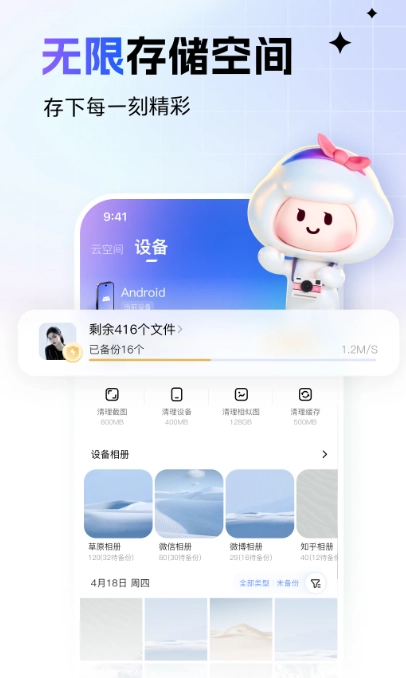 1、无限存储空间:无限量原画质备份,任意手机设备都能访问。
