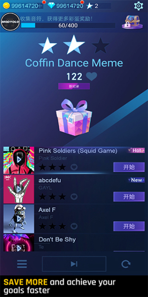 2、挑选你喜爱的音乐,点击后进入游戏。每首音乐的节奏各有差异,难度也不尽相同。