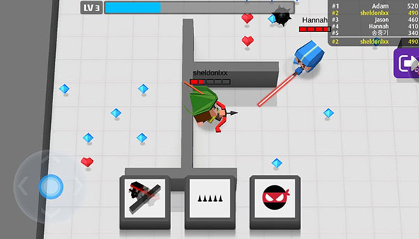 弓箭手大作战官方版是一款多人射击对战类io游戏,既支持人机对战,也能进行多人在线联网对战。在游戏里,玩家将扮演英雄展开战斗,这些英雄是以忍者造型呈现的卡通人偶,分为普通英雄与异世界英雄。每个英雄都有三个初始技能,异世界英雄和对应的普通英雄初始技能相同,只是造型有别,而且不同英雄的血量并非固定一致。游戏采用双摇杆操作模式,在左边屏幕自由滑动会出现摇杆,用于控制走位;右边屏幕自由滑动则能控制攻击方向,朝相应方向滑动此摇杆便可射出弓箭。总体而言,该游戏操作简便,玩法新颖,令人沉浸其中。别再犹豫啦!快叫上三五好友,一同加入《弓箭手大作战》,秀出你们卓越的箭技吧!