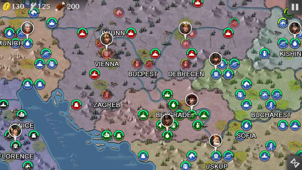1、金钱的获取:在国家疆域内的兵工厂、造船厂、马厂与机械工厂,会在每个回合结束时为各位玩家增加金钱数量。若想获取更多金钱,升级这些建筑即可!