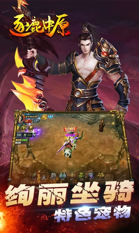 《逐鹿中原手游》是一款大型3D仙魔题材ARPG,绚丽坐骑、特色宠物、逆天神器、极品装备、超级BOSS、征途历练等多样玩法等待玩家发掘,助你踏上君王之路。精美的美术画面借助炫酷3D效果,为玩家展现出一个神魔大战的史诗战场。全自由的PK对抗,极致畅快的战斗对决,你对仙魔大战的所有幻想,都能在这里实现!