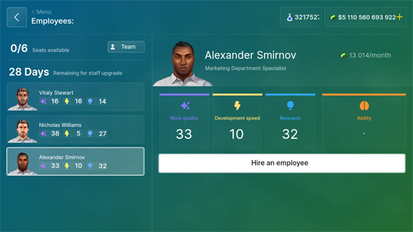 3、不同的员工等你去招募,每位员工都有不同的属性等你去选择。