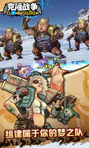 克隆战争的游戏背景设定在2045年的末世废土世界,玩家的目标是挫败F-Tec的阴谋,为此需要招募形形色色的克隆英雄加入己方阵营,共同对抗邪恶的克隆军团。在游戏中,你将与历史上众多名人的克隆体携手作战,同时还要应对那些被操控的邪恶英雄克隆体,投身于这场史诗级的英雄大乱斗之中!
