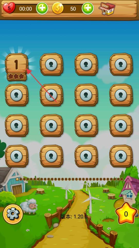 2、在关卡选择界面,找到标有1且无锁标识的关卡方块,点击该方块,加载对应关卡内容,进入第一关的消消乐挑战场景。