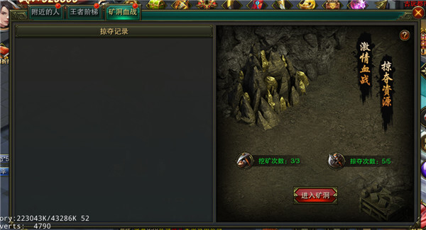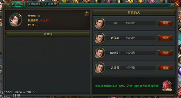竞技玩法分为附近的人、王者阶梯、矿洞血战三种PK玩法!
