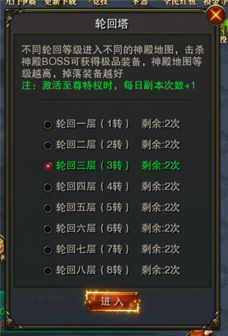 玩家只要达到指定等级或轮回等级,就能进入对应的层数挑战;每层仅有1个BOSS,BOSS被击杀后会有重生时间限制;进入神殿需要消耗轮回卷轴道具,成功击杀BOSS则可掉落大量高级装备。