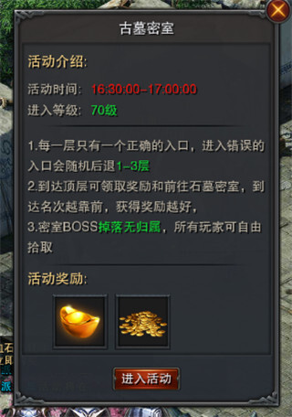 古墓共有8层,玩家需通过场景传送阵进行传送。每层设有4个方向的传送阵,每个方向的传送概率均等且随机,其中只有一个是通往下层的正确入口;若选择错误,则会随机后退1至3层。当玩家到达第8层后,便可找到古墓守卫NPC领取奖励并前往古墓密室。抵达顶层的时间越早,获得的奖励就越丰厚。古墓密室中的BOSS掉落物品无归属权,所有玩家都能自由拾取,且该区域允许自由PK,玩家被击杀后不会掉落自身装备。成功击杀古墓密室的BOSS,将有机会获得大量装备掉落。