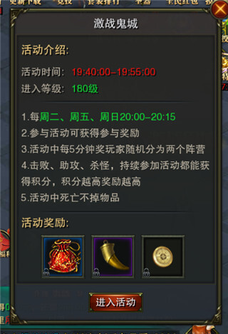 进入活动地图后,系统会依据角色首次进入场景的先后顺序,将大家划分到两个对立阵营。同一阵营的玩家之间无法互相攻击,而敌对阵营玩家进行PK时,胜利的一方个人积分会增加10分,失败死亡的一方个人积分则会扣除。活动结束后,系统会按照玩家的积分情况发放排名奖励。此外,只要在活动场景内停留时间超过5分钟,就能获得威望和龙魂精华奖励。除了上述提到的几大副本,还有更多全新副本等待你去挑战,各种神装道具也等你来获取哦!
