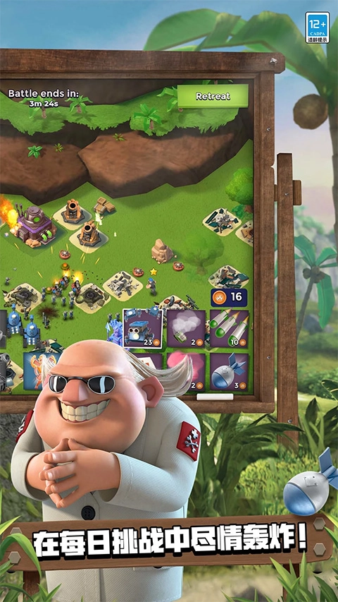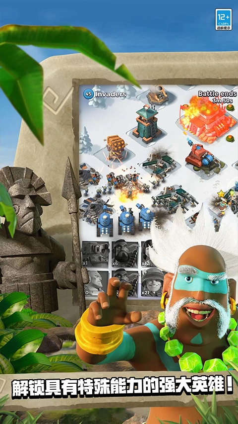 在你美丽的岛屿王国的另一端,还有一些邪恶的黑暗卫队在扰乱部落的生活,指挥我们的军队,打败这些入侵者,BOSS哈曼莫的司令部分散在地图的各个角落,击败他们能获得十分丰厚的资源、水晶、勋章奖励。