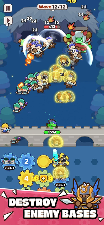 3、点击“战斗”按钮后,齿轮会开始转动以召唤小兵,这些小兵会自动攻击并消灭出现的怪物敌人。