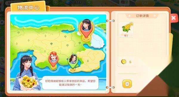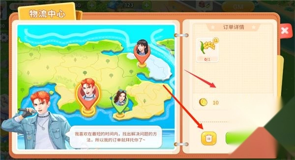 4、在订单所需货物的下方,会显示对应的经验值和金币奖励。要是对当前订单不满意想更换的话,可以点击下方的垃圾桶按钮删除该订单,在规定时间内就能更换为新的订单。